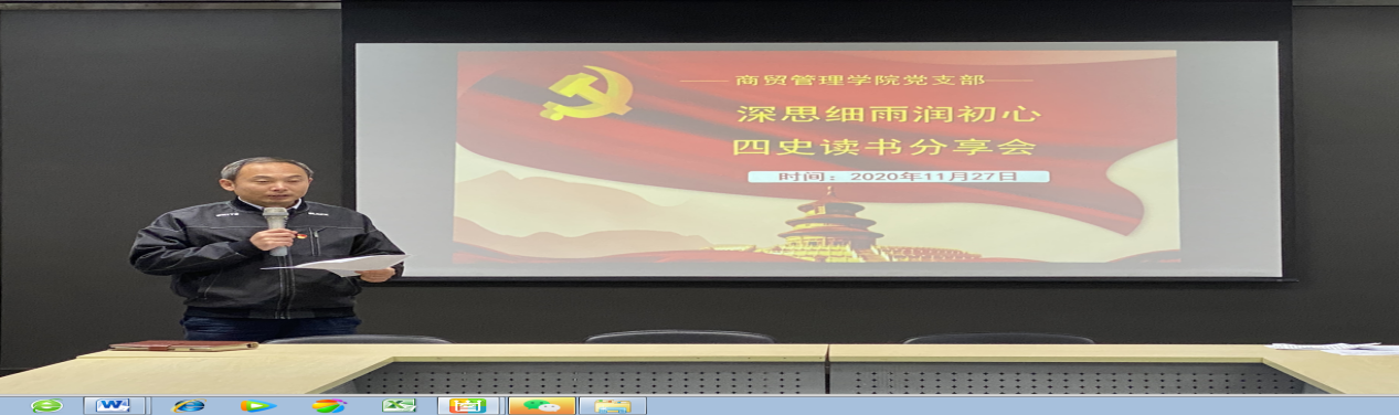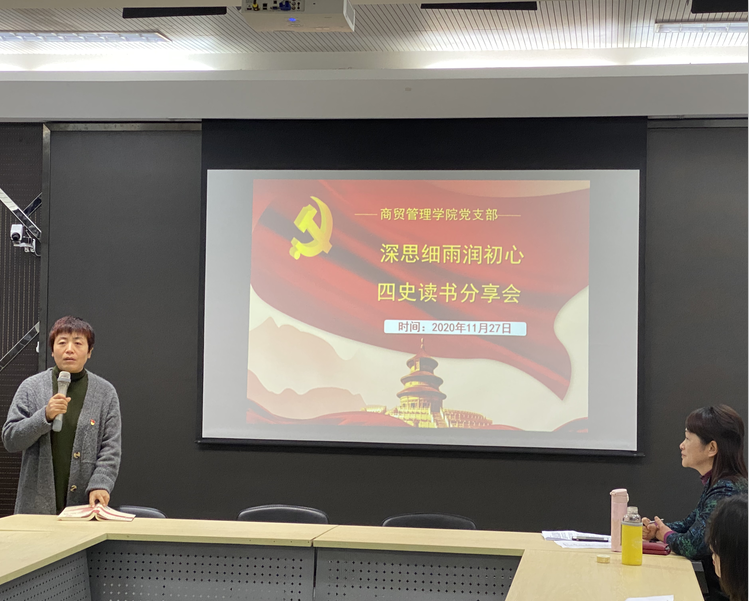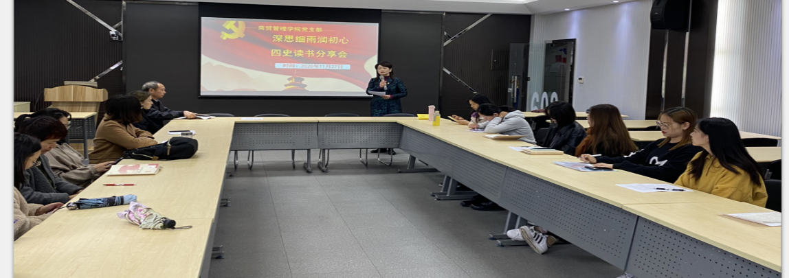 11月27日下午,商贸管理学院党支部在新教603室举行了“深思细雨润初心”------“四史”读书分享会。党员师生围绕“初心”主题,以史为镜,立足岗位开展交流分享。