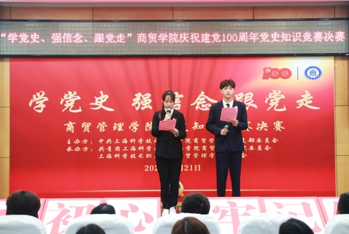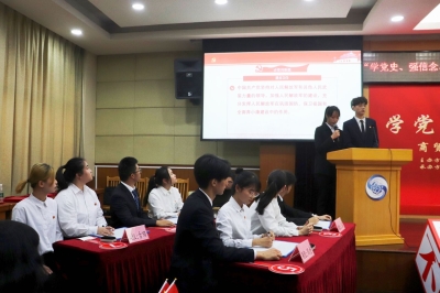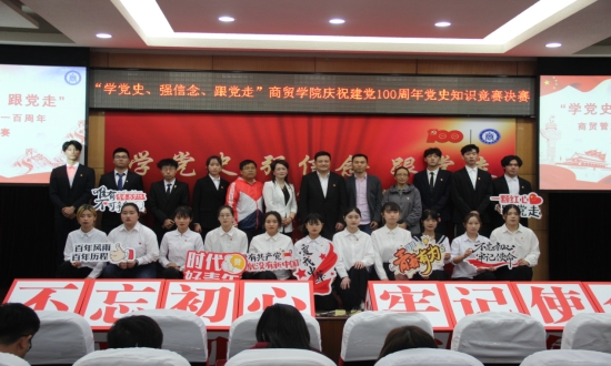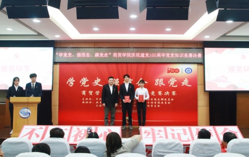 在中国共产党成立百年之际, 5月21日下午,由商贸管理学院党支部主办的“学党史 强信念 跟党走”庆祝建党100周年党史知识竞赛总决赛,在学院五楼报告厅举行。学校党委书记程军,党委委员、宣传部部长曾喜平,党委委员、思政教学部主任吴育红,学生工作部部长沈斌,商贸管理学院党支部书记沈丽娟及全体教师和19、20级各专业学生代表250人参加。