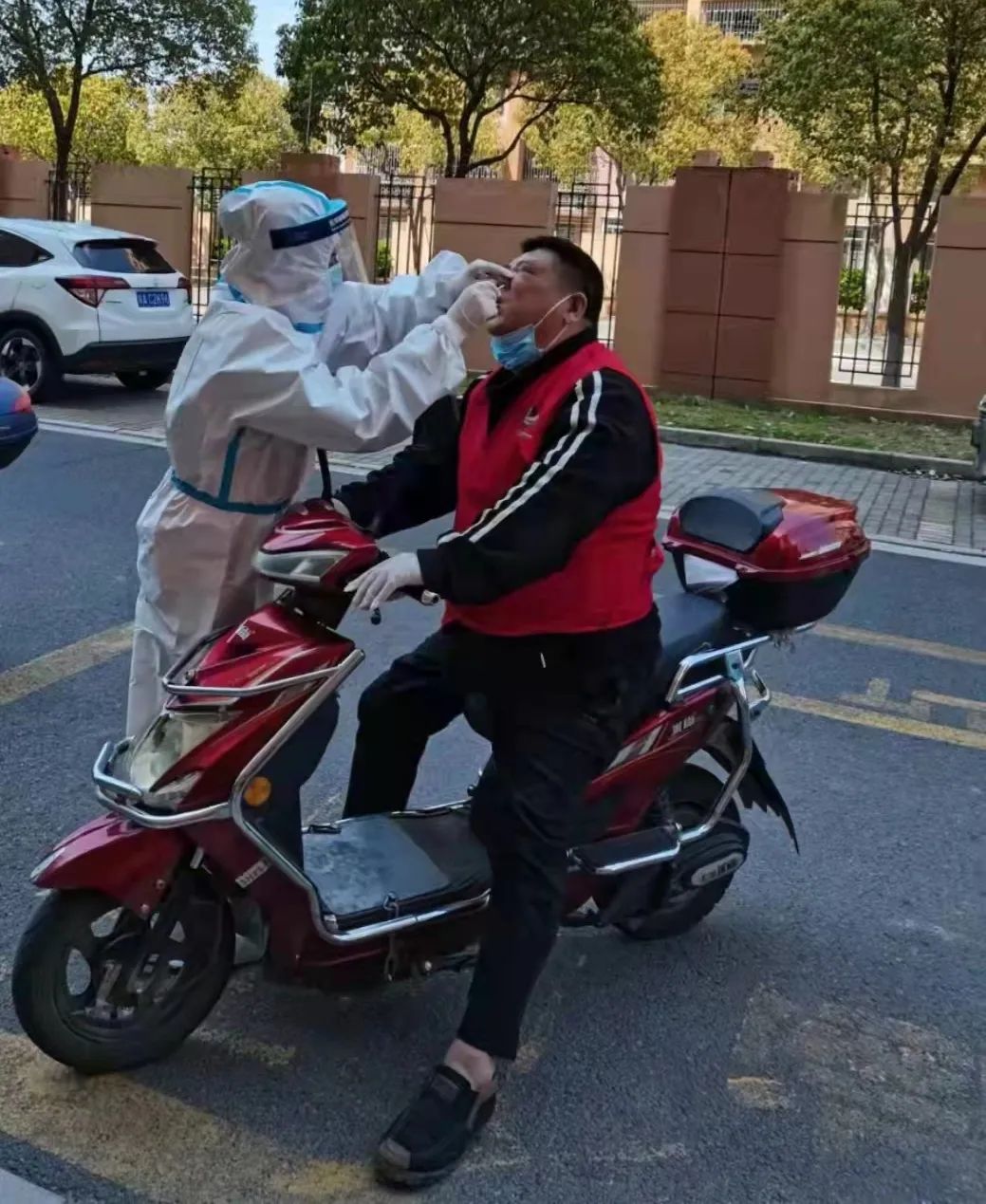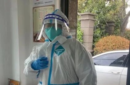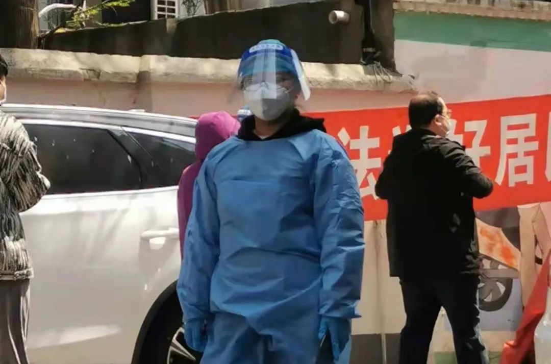 在金山区张泾路干巷居委会当志愿者,经过培训后换上了防护服,帮助每家每户做抗原检测,做到滴水不漏。