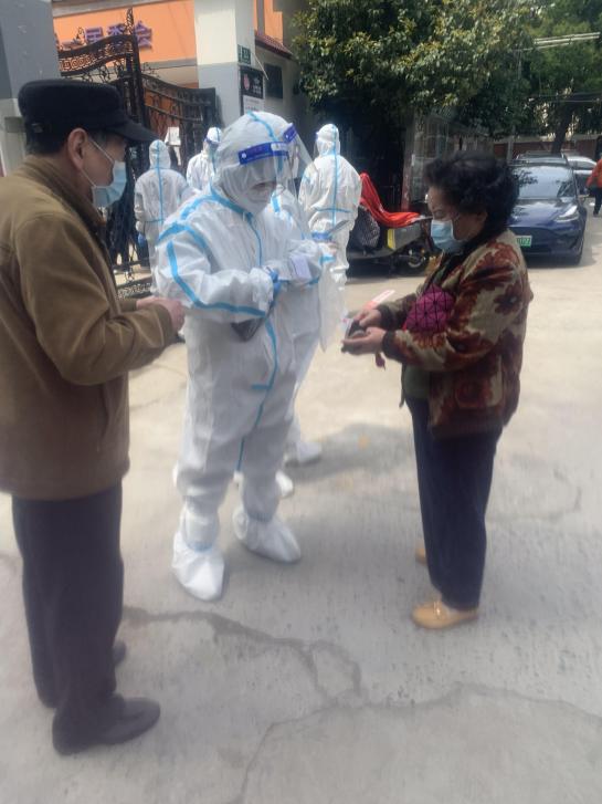 他们有的是“敲门先锋”。在“敲门行动”中,我院党员教师志愿者深入社区每家每户走访,了解并核对详细信息,对其负责楼栋、单元、居室、家庭成员等全部登记在册。挨家挨户发放抗原检测盒,从清晨到夜晚,他们不敢喝水、不想换人、不肯休息,穿着防护服往返于各个核酸检测点……