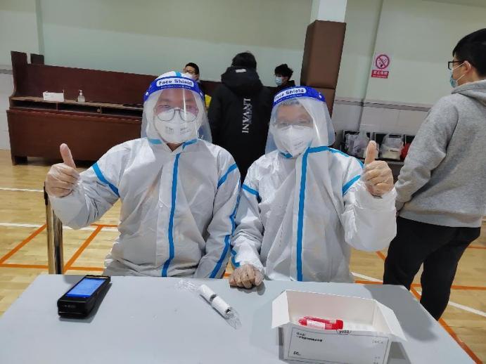 (卢蒙蒙(左一)老师化身大白志愿者 )