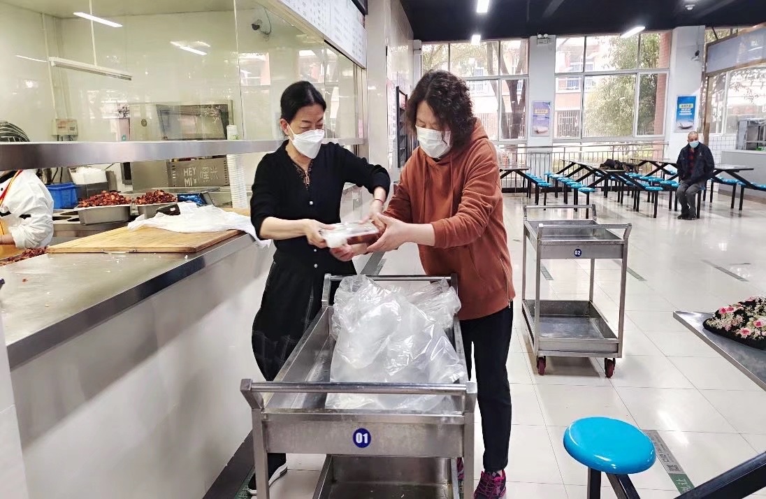 (潘伟、赵秀芳两位老师在食堂为学生送餐)