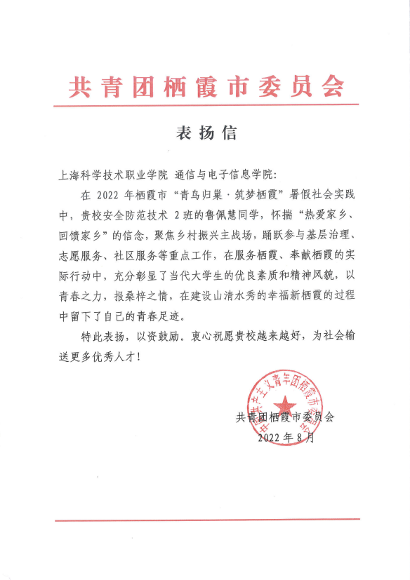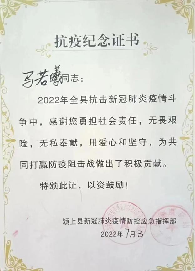 马若曦同学在颍上县抗击新冠肺炎疫情斗争中,勇担社会责任,无畏艰险,无私奉献,用爱心和坚守,为共同打赢防疫阻击战做出了积极贡献。