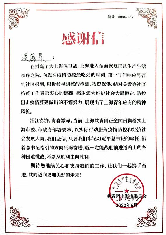 凌鑫晨同学在疫情防控时期,积极响应号召,前往社区参与核酸检测、物资保供、结对关爱等社区抗疫志愿服务工作当中,为防控阻击疫情蔓延作出了不懈努力,展现出上海青年应有的精神风貌。