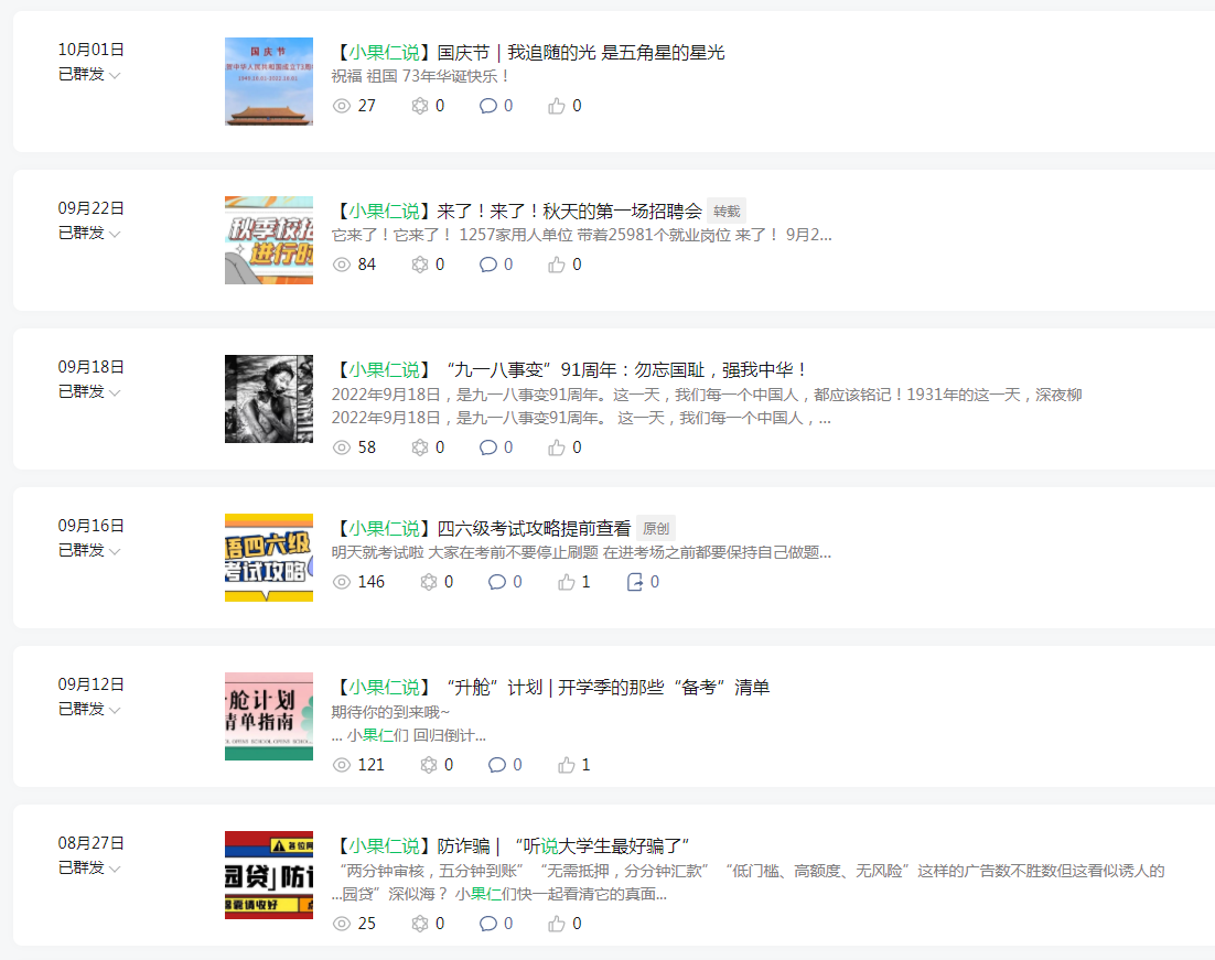 《小果仁说》专栏,重点发布时代主旋律和校院的学生重点工作