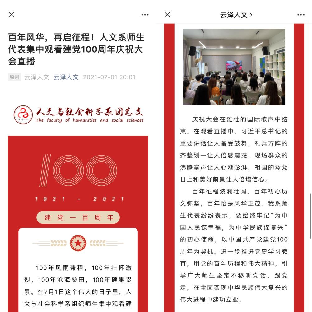2021年,结合中国共产党成立100周年重要时间节点,学院公众号“云泽人文”,抓住“上海作为党的发源地”,红色资源丰富这一优势,自党史学习教育开展以来,结合青年话语体系与传播特点,结合图文、视频、音频等形式,开辟了《百年回眸》《红歌里的故事》党史学习专栏,发布相关作品30余篇。此外,公众号坚持在重要的时间节点和热点事件期间,主动推送相关文章,把握舆论导向。