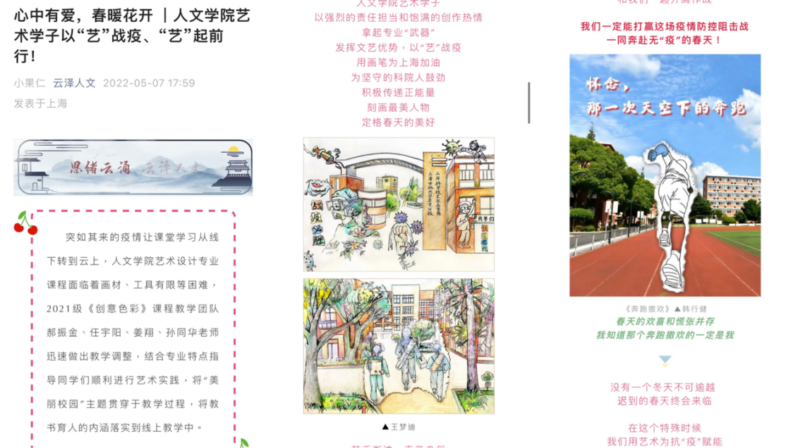 同时,人文学院各专业也注重线上对学生文化育人的体系培养。艺术设计专业在2022年上半年疫情封校期间,结合专业特点线上指导同学们顺利进行艺术实践,将“美丽校园”主题贯穿于教学过程,将教书育人的内涵落实到线上教学中。
