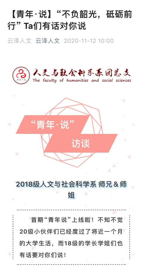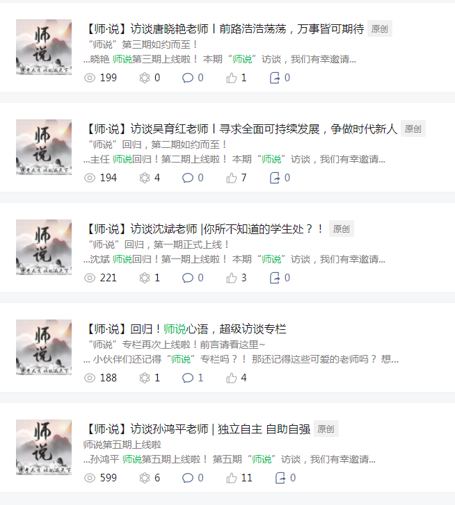 人文学院官方公众号自2020年9月起推出《师说》、《青年说》栏目,目前已累计专访13期