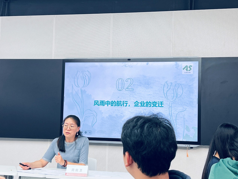 随后,周航卫结合自身的创业实践,分享了高质量发展对企业发展的重要意义,以及高质量发展对青年学生的要求。她的分享不仅让同学们对企业发展有了更直观的认识,也激发了同学们对高质量发展的进一步思考。
