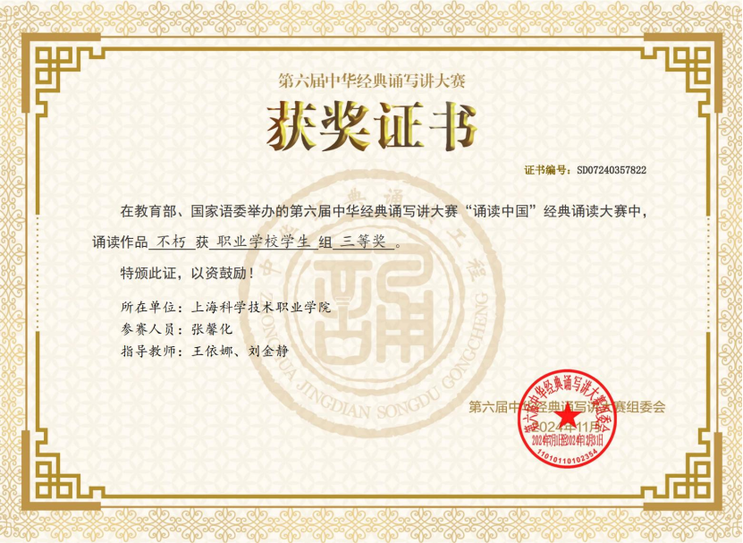 本届大赛规模空前,竞争异常,全国共有132万余件作品入围初赛,历经复赛与决赛的层层严格选拔,最终8510件作品脱颖而出,其中,“诵读中国”经典诵读大赛的获奖作品2025件,职业学校组学生作品275件获奖,上海的职业院校仅有4个作品获奖,我校是其中之一。