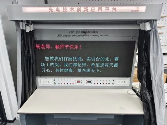 9月10日清晨,在上海科学技术职业学院产教融合实践中心的智能安防实训室里,无人机和奖状有序排列着,2024届毕业生项俊辉和王凯凯正在LED 显示综合实训模组设备上进行系列测试。屏幕上滚动着“您教我们打磨技能,实训台的光,赛场上的奖,我们都记得,希望您每天都开心,身体健康,桃李满天下”的字样。