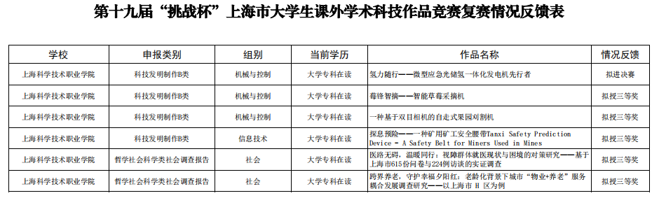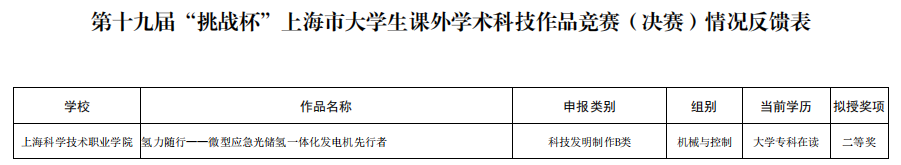 5月23日至25日,由共青团上海市委员会、上海市教育委员会、上海市科学技术委员会、上海市科学技术协会、上海市社会科学界联合会等联合主办的第十九届 “挑战杯” 上海市大学生课外学术科技作品竞赛决赛、闭幕式暨青年科技创新先锋报国分享会圆满落幕。我校学子在本届大赛中喜获二等奖1项、三等奖5项,实现我校在该赛事的新突破!