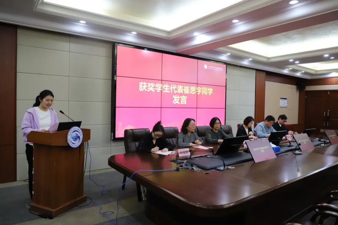 活动上对“悦读节”系列活动成果进行展示回顾,宣读获奖名单并颁奖。诗词讲解大赛特等奖及2024年优秀读者获得者,商贸管理学院崔思宇同学作为学生获奖代表发言。她说值此世界读书日之际,有幸分享阅读之悟;悦读节创新采用读、听、诵、摄、赛、展六维参与模式,吸引众多同学们积极参与。作为大一新生,获诗词讲解大赛特等奖与优秀读者双重荣誉,深感典籍传承的包容性——诗词从未设限,只要心存热爱,人人皆可成为传统文化的追光者。她备赛《桃花源记》时,在图书馆反复付十余篇论文研读与朗诵视频揣摩,印证了阅读的真理:翻开书页即翻开人生新篇。作为传统文化追光者,她提出三愿:深耕诗词学术、推广诵读活动、用新媒体活化经典,让诗词成为年轻人的文化潮品。以顾城诗句作结的她呼吁:愿我们永葆对阅读的虔诚,在文海中追寻精神原乡。