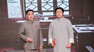 舞台上,周恩来(梁春书饰)和毛泽东(许馨文饰) 同台演绎