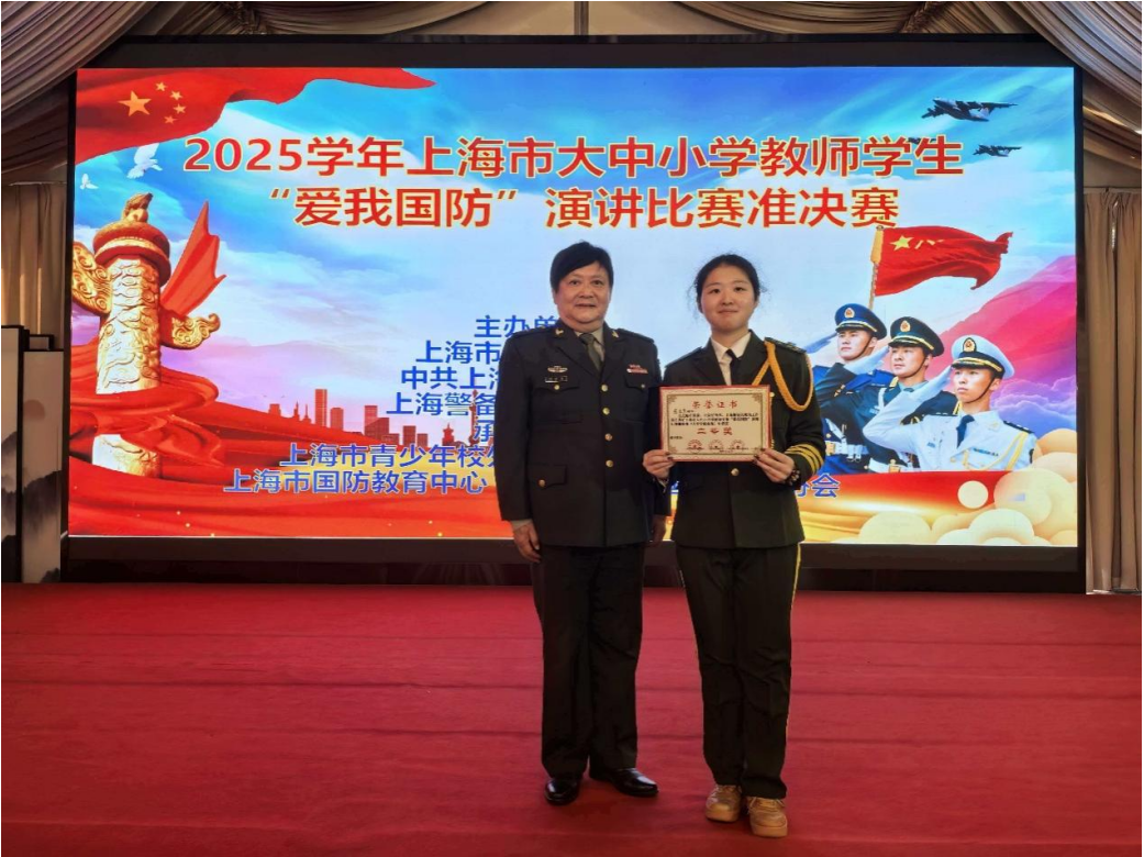 近日,由上海市教育委员会、中共上海市委宣传部、上海警备区政治工作局联合主办的2025学年上海市大中小学校师生“爱我国防”演讲比赛准决赛,在上海市青少年校外活动营地——东方绿舟圆满落幕。经过激烈角逐,我校崔思宇同学凭借出色的表现脱颖而出,荣获二等奖,展现了新时代青年学子深厚的家国情怀与昂扬的精神风貌。
