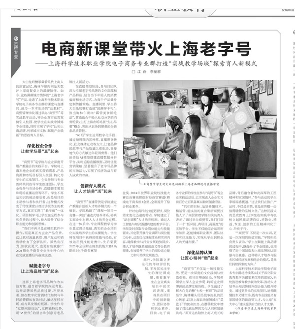 近日,《中国教师报》以《电商新课堂带火上海老字号——上海科学技术职业学院电子商务专业群打造“实战教学场域”探索育人新模式》为题,再次报道我校商贸管理学院电子商务专业群的教育改革实践。这是继2023年该报以《商科现代学徒制的上科院答卷》聚焦我校现代学徒制改革后,又一次对我校在人才培养与课堂教学创新领域的深度关注。