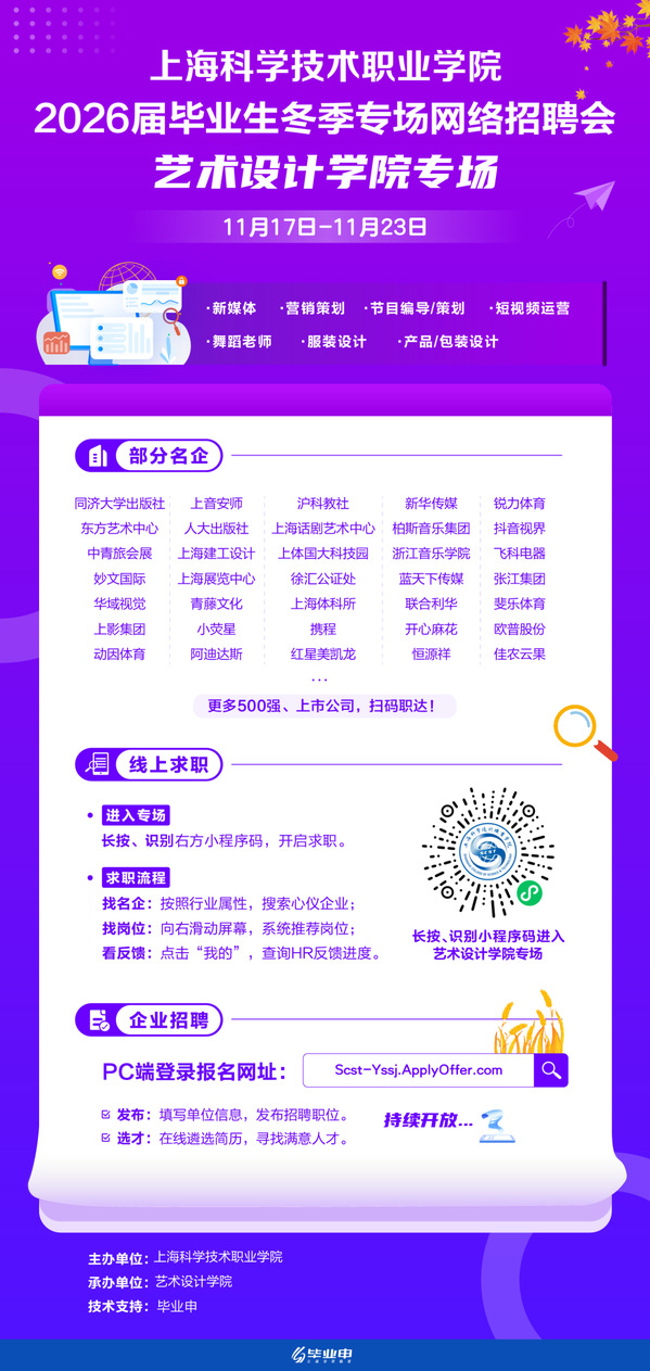 艺术设计学院专场 | 上海科学技术职业学院2026届毕业生冬季专场网络招聘会