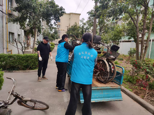 与校团委、嘉定镇街道团工委对接,由宣讲朗诵团成员与社区志愿者组成的“雷锋小队”集结在花园弄社区,对长期侵占居民居住空间的废旧车辆发起了一场“清零行动”。社区楼道内,废旧车辆横七竖八地堆放,不仅占用了公共空间,更对消防安全造成了隐患,志愿者们逐层排查楼道、疏通通道,清理了大量废旧自行车、电动车,在消除安全隐患的同时,让社区环境焕然一新。
