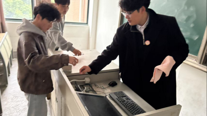 3月14日,宣讲团成员化身“校园雷锋”,走进校园新教学楼开展义务劳动。他们手持抹布、酒精喷雾等工具,分组承包几个教学楼层“责任区”:擦窗台、清讲台……用行动践行“劳动即教育”的理念。