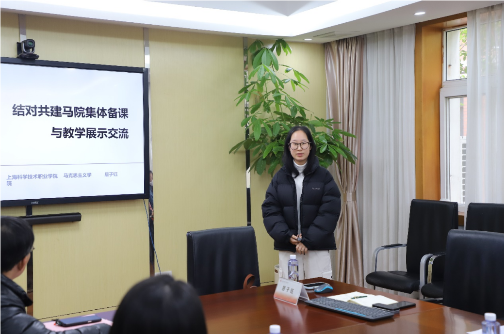为深入贯彻习近平总书记关于新时代学校思政课建设的重要指示精神,落实党的二十届四中全会决策部署,推动思政课内涵式发展,12月12日下午,上海科学技术职业学院、上海体育大学、上海工艺美术职业学院三校“结对共建”马克思主义学院“深入学习贯彻二十届四中全会精神,推动思政课建设内涵式发展”教学展示与示范交流在我校成功举办。上海体育大学马克思主义学院院长、博士生导师胡德平教授、嘉定区委党校副校长夏侯建球、学校马克思主义学院党支部结对共建单位、上海科技管理干部学院副院长顾玲琍研究员、上海工艺美术职业学院马克思主义学院院长陈文杰等参加活动,学校党委副书记、常务副院长许金如出席并致辞,马克思主义学院院长王依娜主持。