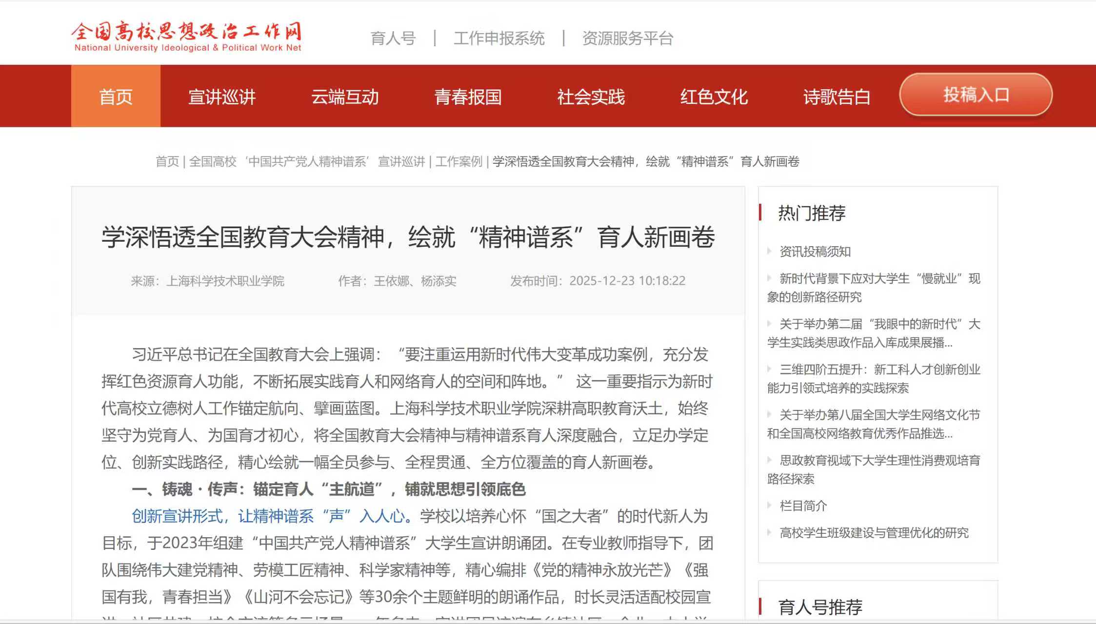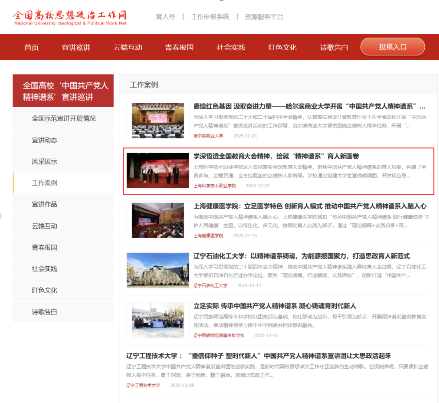 近日,教育部全国高校思政工作网正式发布“全国高校‘中国共产党人精神谱系’宣讲巡讲”优秀工作案例。经严格遴选,上海科学技术职业学院报送的案例成功入选,至此成为全国获此殊荣的6所高校之一。该案例依托学校长期深耕的育人品牌与创新实践,系统总结了我校在2025年全国高校“中国共产党人精神谱系”宣讲巡讲工作中的特色做法与显著成效,获得教育部平台的高度认可与推广。