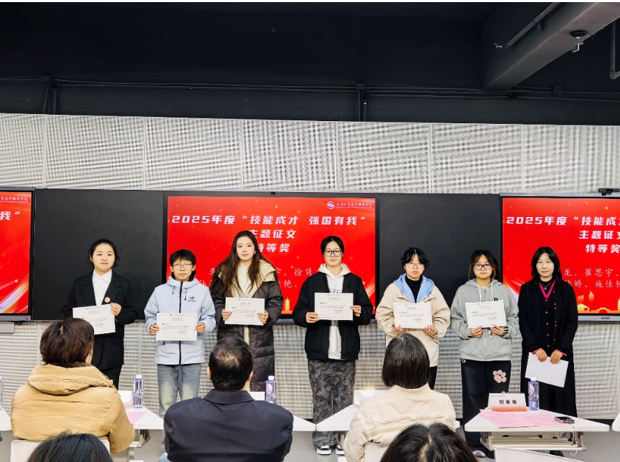 商贸管理学院党总支书记刘年年为荣获2025年度“技能成才 强国有我”主题征文特等奖的同学:李金龙、崔思宇、徐隽彦、孙莲、陆娇、施佳艳、司徒筱雯颁奖。