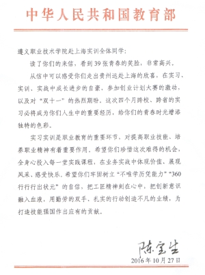 (图为教育部部长陈宝生给遵义职院赴我院实习学生的回信)