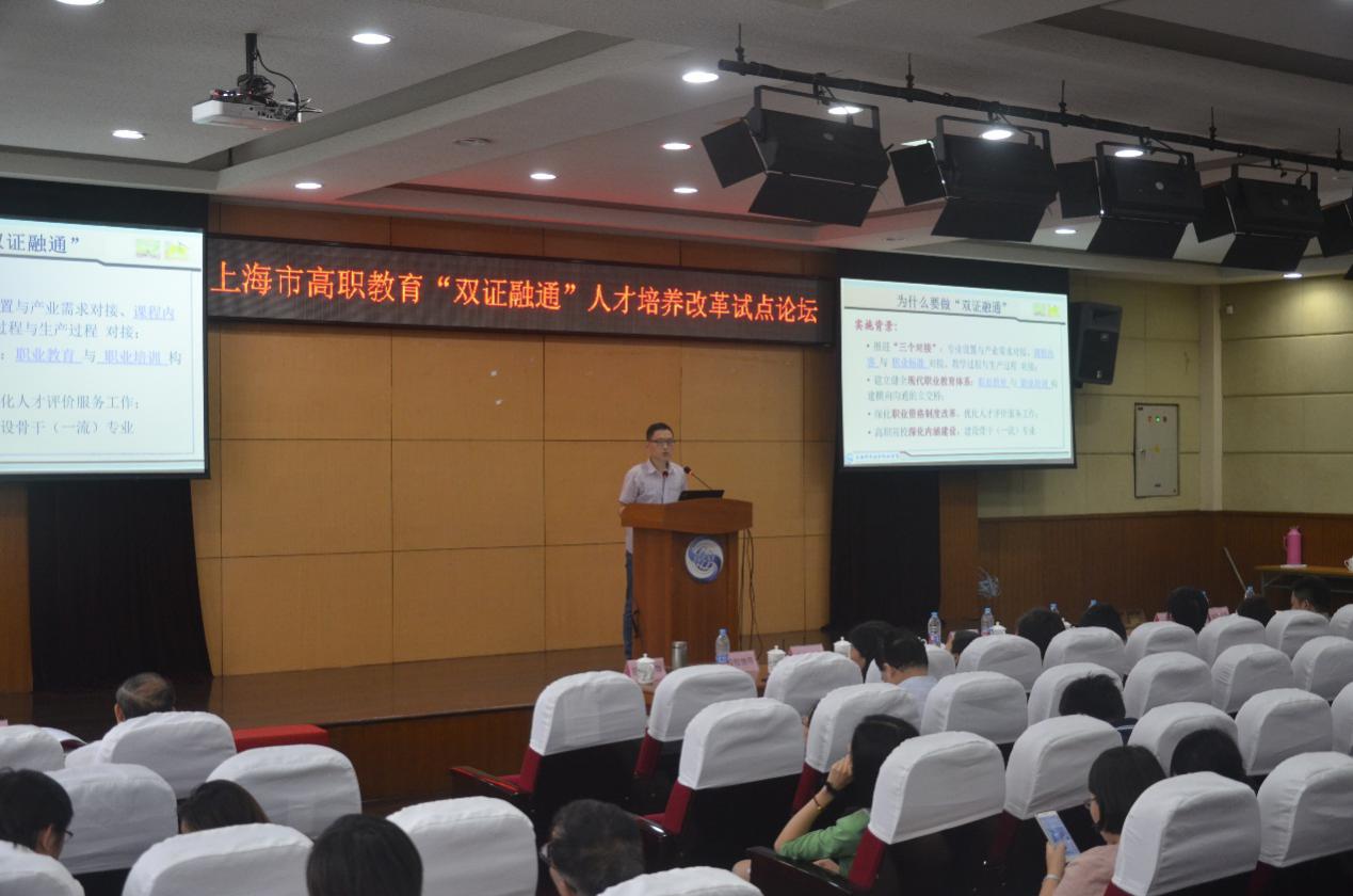 6月15日下午,上海市高职教育“双证融通”人才培养改革试点论坛在上海科学技术职业学院顺利举行。上海市教委高教处副处长赵坚,上海市职业技能鉴定中心主任孙兴旺,研发管理科科长夏莹,考务管理科科长孙德荣,以及21所“双证融通”改革试点高职院校分管领导、教学管理部门领导、试点专业主任以及相关专业教师出席了论坛会。