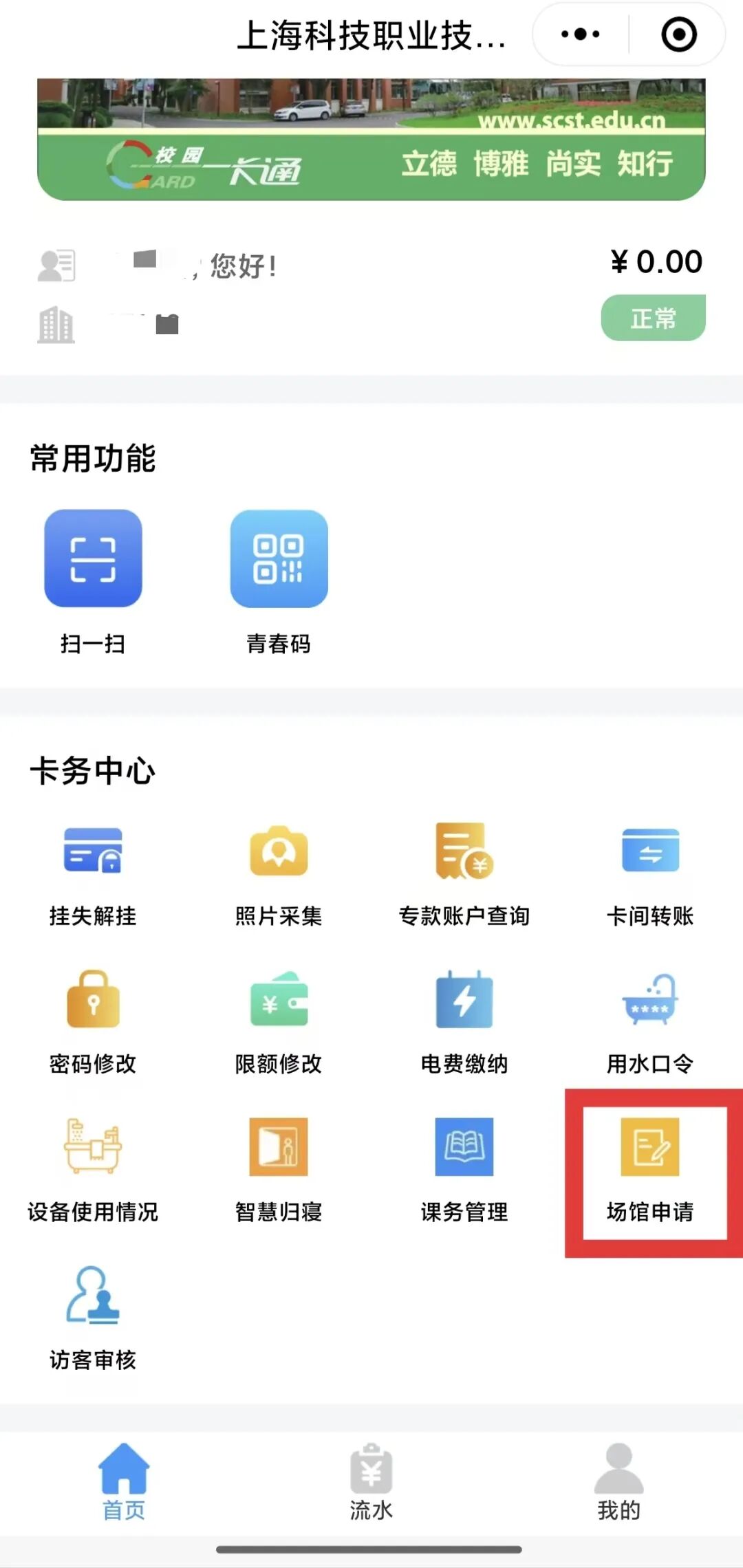1、进入“i在科院”小程序,点击界面下方的“场馆申请”。