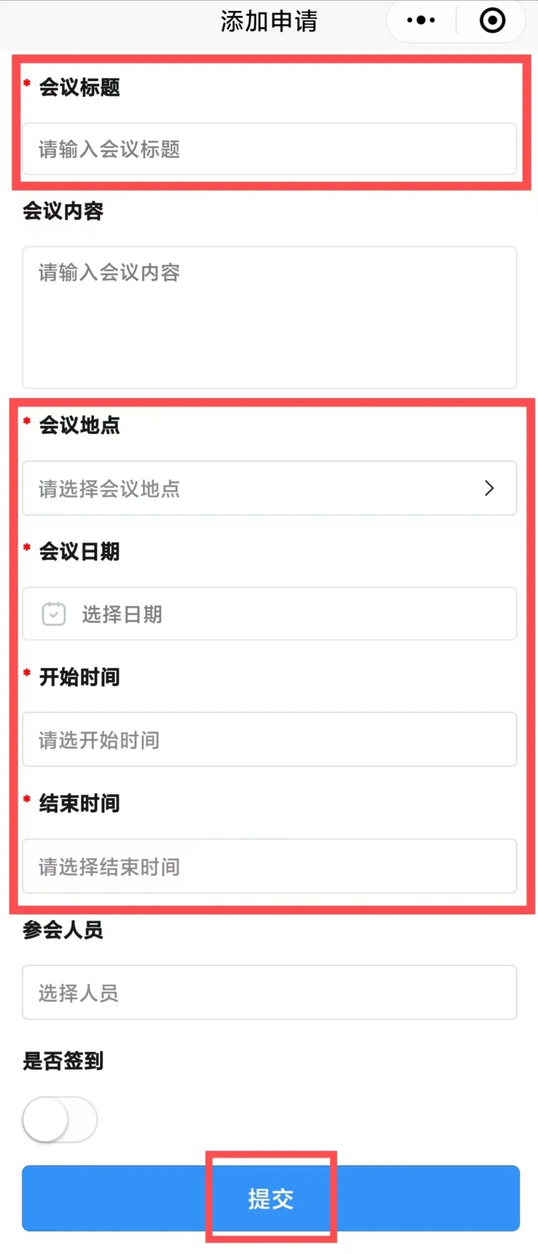 3、填入会议相关的信息,包括标题、地点、时间等必填内容,填写完毕确认无误后点击下方提交。