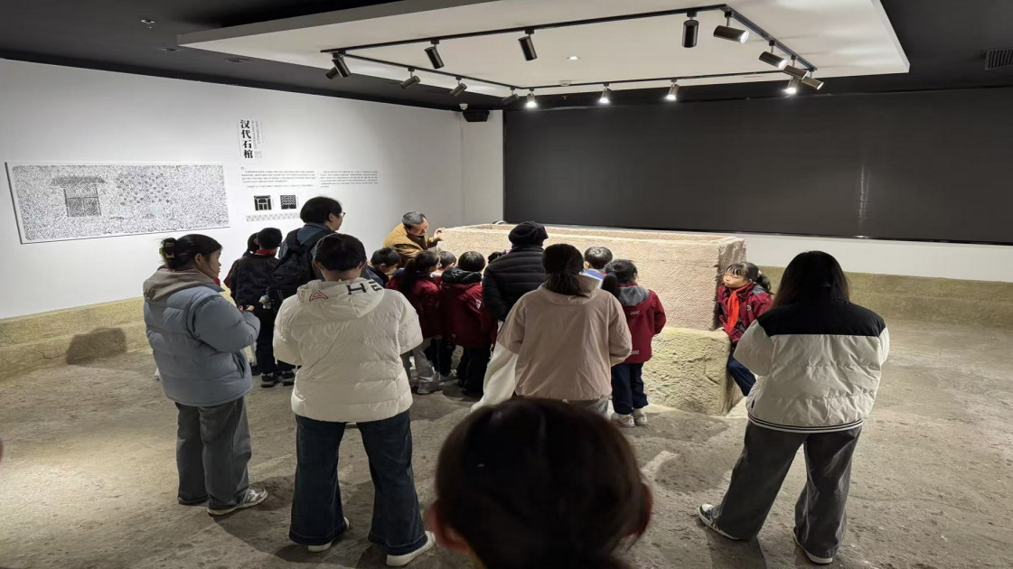 聆听古砖之声”活动在管老师讲解的“龙砖”背景中徐徐展开。宣讲队成员与同学们共同参观了一楼三大主题展区,分别为年代砖展区,姓氏砖展区和汉代石棺展区,和拓画和文创品活动区。管老师在每 一个展区都为文脉传承公益宣讲队做了特色砖的介绍,有踩着小狗爪印的汉字砖,有布满图画的画像砖,有刻着子路和陈年的镇宅砖,队员们在一个个古代专有名词前不断努力记忆着,寻找着属于自己姓氏的姓氏砖;在巨大的汉代石棺前,随着管老师的指导下,细细寻找着汉代的每一个生活画面,踊跃提问,此刻仿佛已穿越到汉代,重温了那时的“种植、射猎、酿酒、品茶、歌舞与驾马出行”。疁言堂成员深入了解古砖背后的社会风貌与工艺智慧,不断发出感叹“一块砖就是一页历史啊”。
