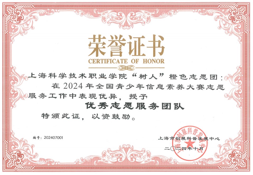 自项目启动以来,我校在赛事筹备与开展过程中组织近400余名学生参与到大赛志愿服务活动中,让学生在志愿实践中锤炼品格、增长才干,其中120余名学生凭借出色的服务表现,荣获全国青少年信息素养大赛志愿者证书和荣誉证书,我校“树人”橙色志愿团获评优秀志愿服务团队,学校荣获优秀组织单位。