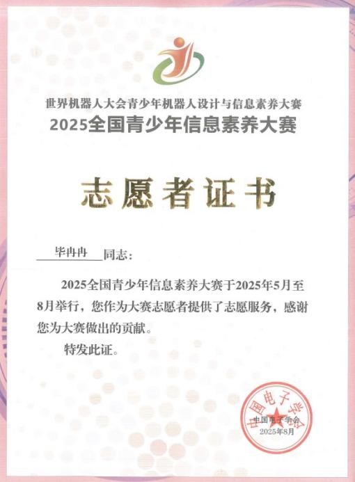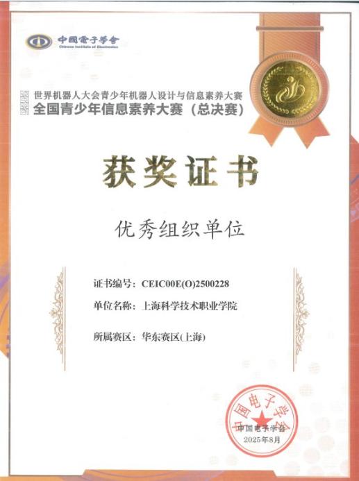全国青少年信息素养大赛是中国电子学会主办的国家级青少年科技竞赛,为《教育部办公厅关于公布2022—2025学年面向中小学生的全国性竞赛活动的通知》认定的白名单赛事,也是世界机器人大会青少年机器人设计与信息素养大赛的核心组成部分。2025年,我校凭借在赛事组织、育人实践以及志愿服务中的突出表现荣获大赛优秀组织单位,不仅彰显了我校创新资助育人模式和深耕志愿服务实践的显著成果,更是学校在人才培养中践行五育并举、赋能学生全面发展的生动体现。