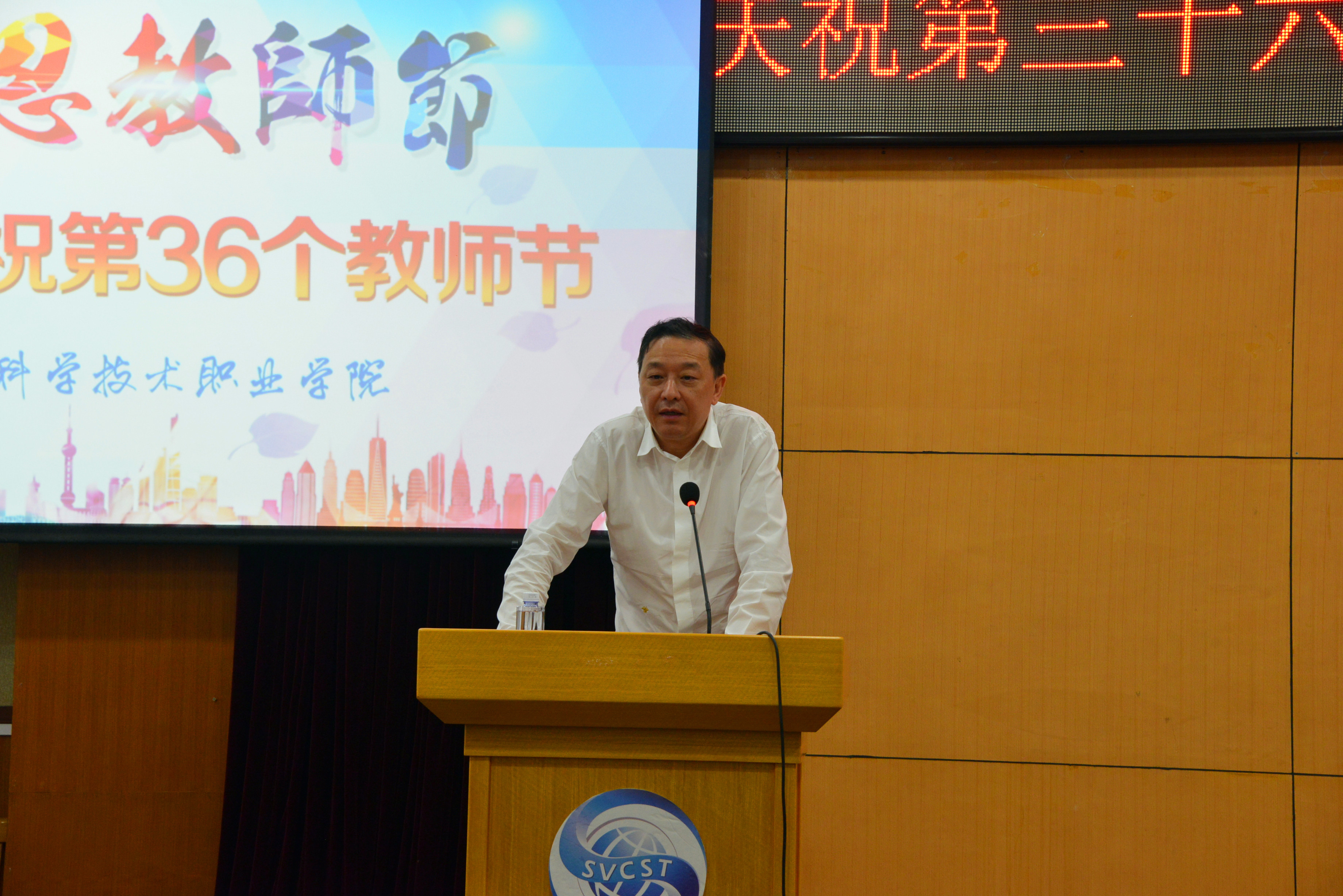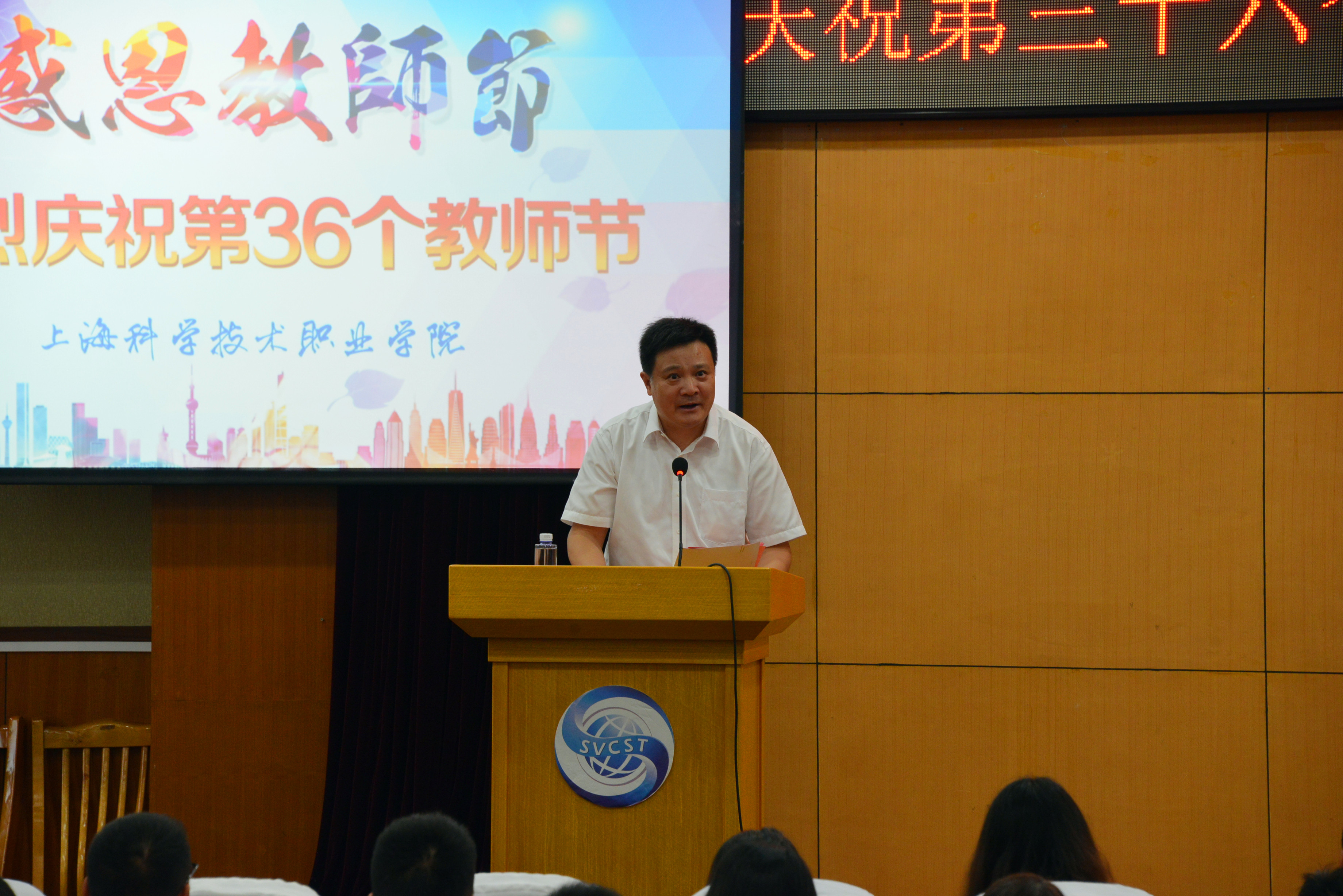 丹桂飘香又一年。9月18日下午,上海科学技术职业学院全体教职员工欢聚多功能报告厅,召开庆祝第三十六个教师节暨新学期工作部署大会。常务副院长韩芳主持会议。