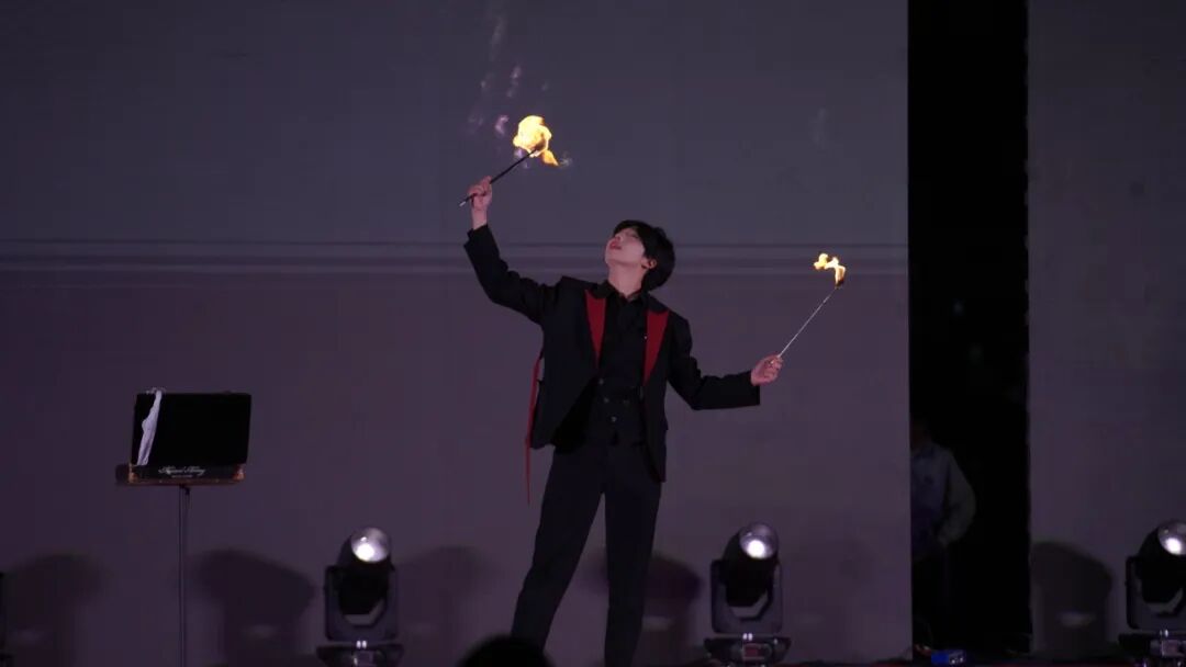 最令人惊艳的当属TAM魔术社唐嘉祥的《律动》!作为第三届全国高校魔术社团联盟展演上海地区代表、上海高校魔术联盟理事长,他用指尖的奇迹打破常规,纸牌翻飞、道具变幻,每一个魔术瞬间都让现场惊呼连连,将晚会氛围推向高潮。