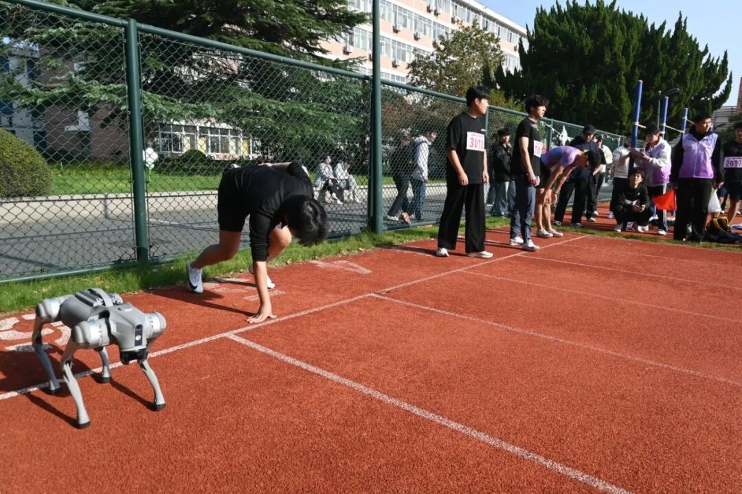 运动会100米男子预赛现场,机器狗“笨笨”首次亮相田径赛道,成为本届运动会最具科技感的亮点时刻。